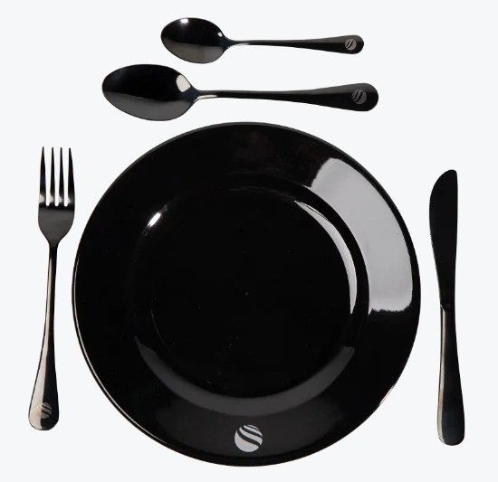 – Geleverd met bord, mes, vork, lepel en theelepel