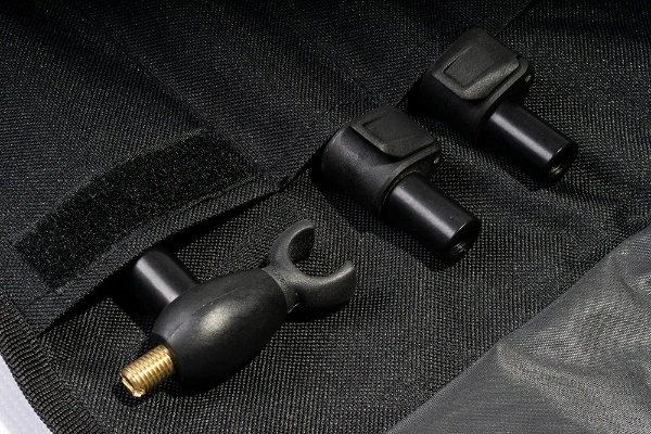 Ze zitten in een handige uitklapbare, gevoerde tas waar ook de beetmelders en vissteunen in passen.